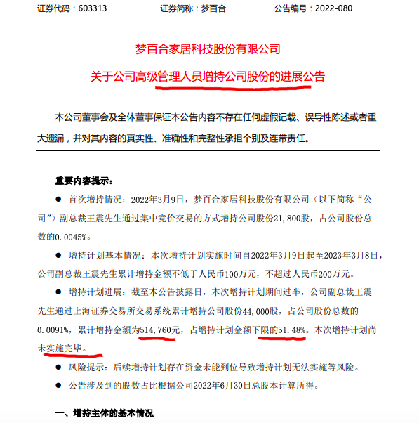 中华网财经9月9日讯:梦百合(603313)(603313.SH)发布关于公司高级管理人员增持公司股份的进展公告称,截至本公告披露日,本次增持计划期间过半,公司副总裁王震先生通过上海证券交易所交易系统累计增持公司股份4.4万股,占公司股份总数的0.0091%,累计增持金额为51.48万元,占增持计划金额下限的51.48%。本次增持计划尚未实施完毕。