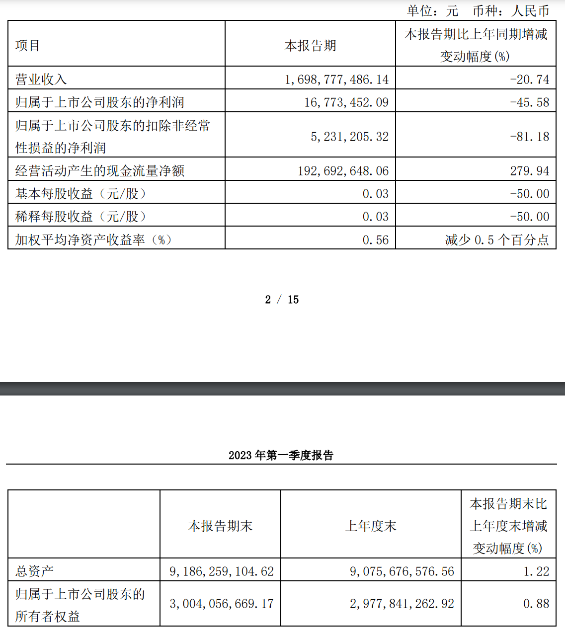 公告显示,2023年第一季度,梦百合实现营业收入16.99亿元,同比减少20.74%;实现归属于上市公司股东的净利润1677.35万元,同比减少45.58%。