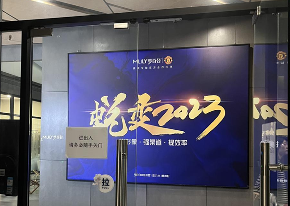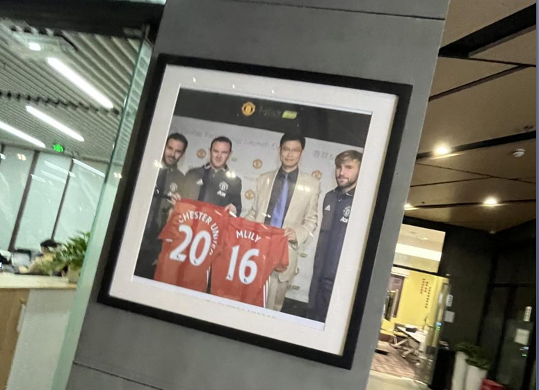 梦百合上海公司大厅悬挂着倪张根与曼联球员的合照