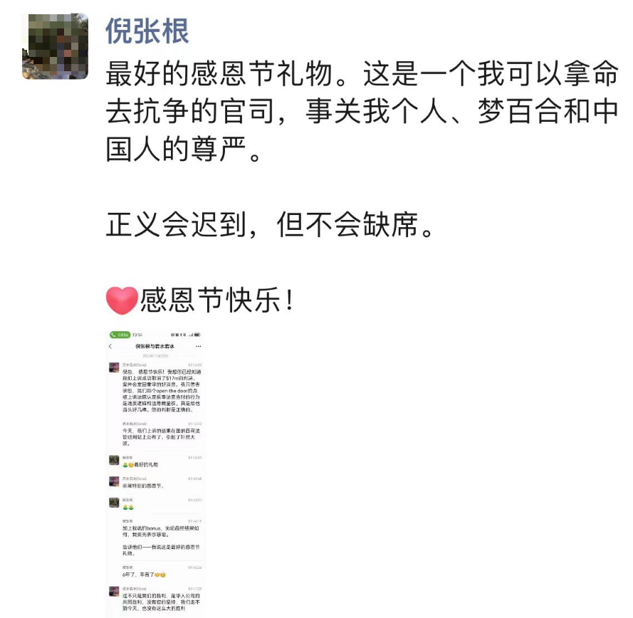 倪张根还分享了一张聊天截图,内容写道:“梦百合方面上诉成功,上诉法院认定原审法官当时的行为是违反逻辑和滥用裁量权。上诉的结果在田纳西司法管理网站公布,引起了轩然大波。” 他同时还评论道:“这是最好的感恩节礼物(11月23日)。”
