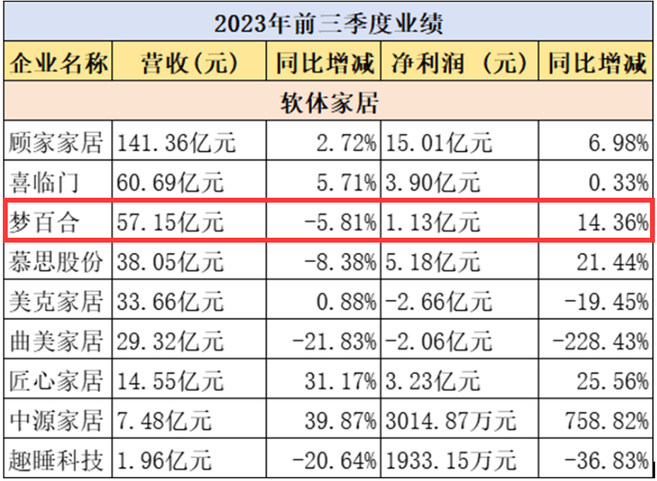 从经营规模来看,今年前三季度,梦百合实现营业收入57.15亿元,仅次于顾家家居和喜临门,排在国内软体家居行业第三位。
