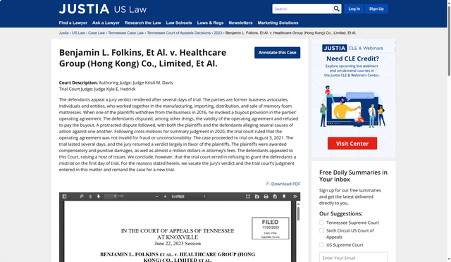 2023年底,美国田纳西州上诉法院判决,陪审团的裁决和初审法院的判决“是不合理的”,判决被撤销,案件被发回重审。