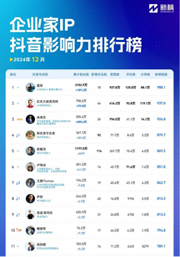 作为家居行业出了名的性格耿直、快人快语的老板,倪张根在抖音平台拥有近200万粉丝,前不久,新榜发布的2024年12月企业家IP抖音影响力排行榜中,倪张根位列第11。