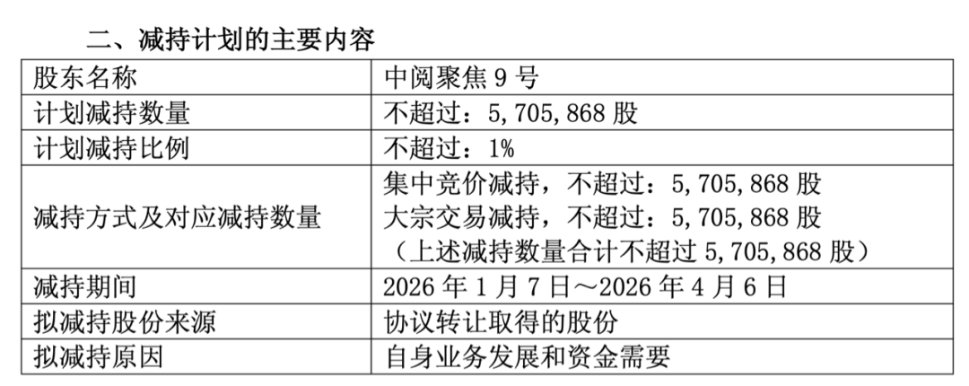 梦百合进一步披露,此次中阅聚焦9号减持时间窗口为公告披露之日起15个交易日后的3个月内实施,也就是在2026年1月7日至4月6日期间,减持价格将按照减持实施时的市场价格确定,减持方式则是集中竞价和大宗交易两种。