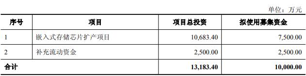 本次发行拟募集资金总额不超过10,000万元(含本数),且不超过公司最近一年末净资产的20%,扣除相关发行费用后的募集资金净额将全部用于嵌入式存储芯片扩产项目、补充流动资金。