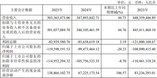 2022年至2025年,公司营业收入分别为8.00亿元、4.48亿元、3.48亿元、5.04亿元,归属于上市公司股东的净利润分别为-5,539.19万元、-1.08亿元、-9,947.35万元、-1.20亿元,归属于上市公司股东的扣除非经常性损益的净利润分别为-6,597.40万元、-1.10亿元、-1.06亿元、-1.15亿元,经营活动产生的现金流量净额为-2.98亿元、8,323.63万元、6,722.52万元、1.39亿元。