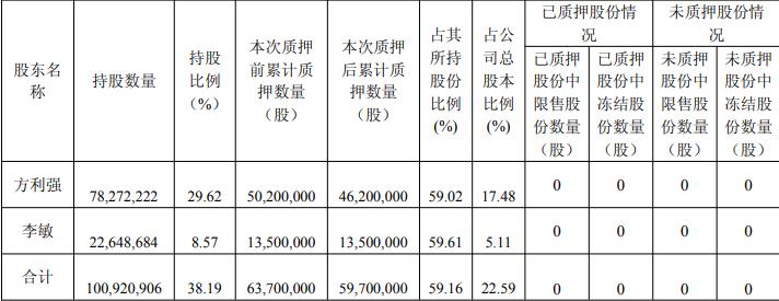 公司2025年12月4日披露关于股东部分股份质押及解除质押的公告,公司控股股东方利强与一致行动人李敏共计持有公司股份100,920,906股,占公司总股本的38.19%。本次质押及解除质押后,方利强与一致行动人累计质押股份59,700,000股,占其合计持股数量的59.16%,占公司总股本的22.59%。