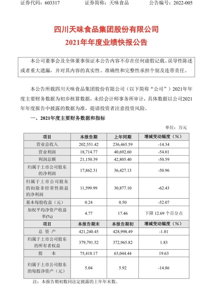 1月27日,天味食品(603317.SH)发布业绩快报称,2021年营收为20.26亿元,同比降14.34%;净利润为1.79亿元,同比降50.96%。
