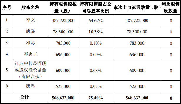 天味食品上市已有三年时间,此次解禁涉及股东共六位,包括邓文、康璐、邓聪、邓志宇、唐鸣及江苏中韩晨晖朗姿股权投资基金(有限合伙)。邓文、康璐为实控人夫妇,亦是公司董事长及副董事长,此次解禁超99%部分集中在二人之手,其余自然人为实控人亲属。