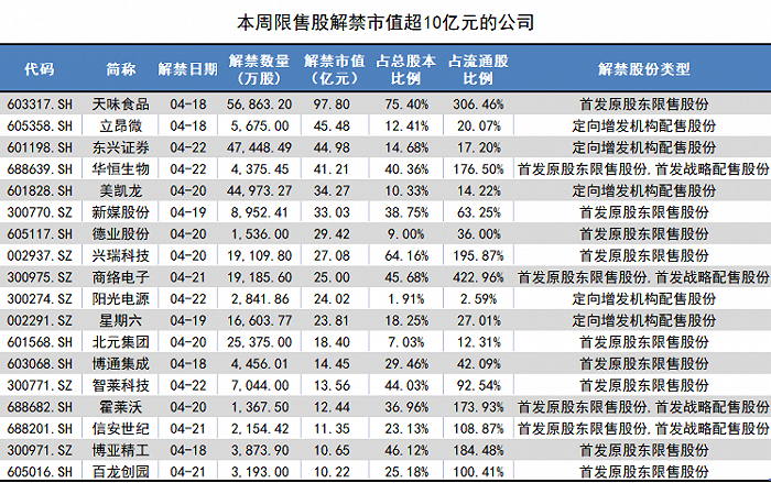 解禁市值超过10亿元的上市公司共计有18家,除天味食品外,立昂微(605358.SH)、东兴证券、华恒生物(688639.SH)解禁市值超过40亿元。