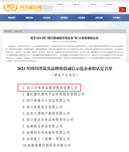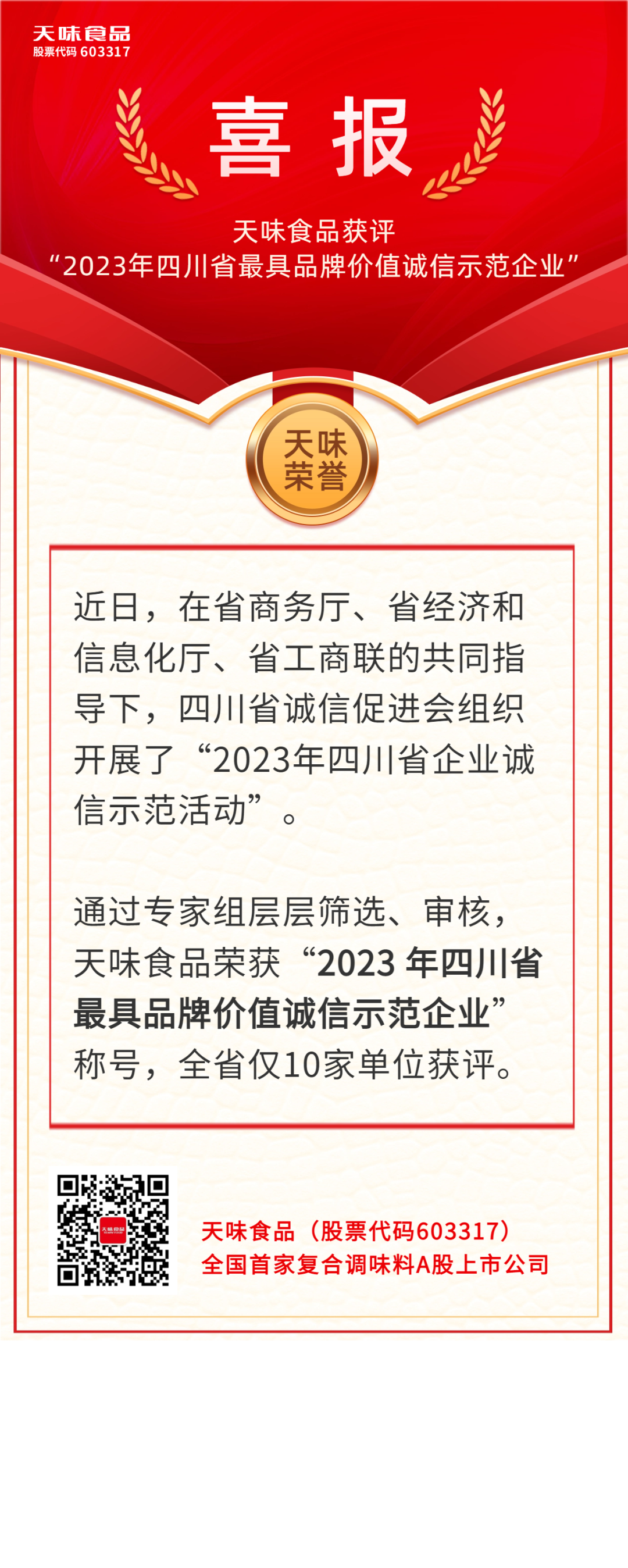 “2023 年四川省最具品牌价值诚信示范企业”称号是行业与社会对天味食品品牌发展的认可。