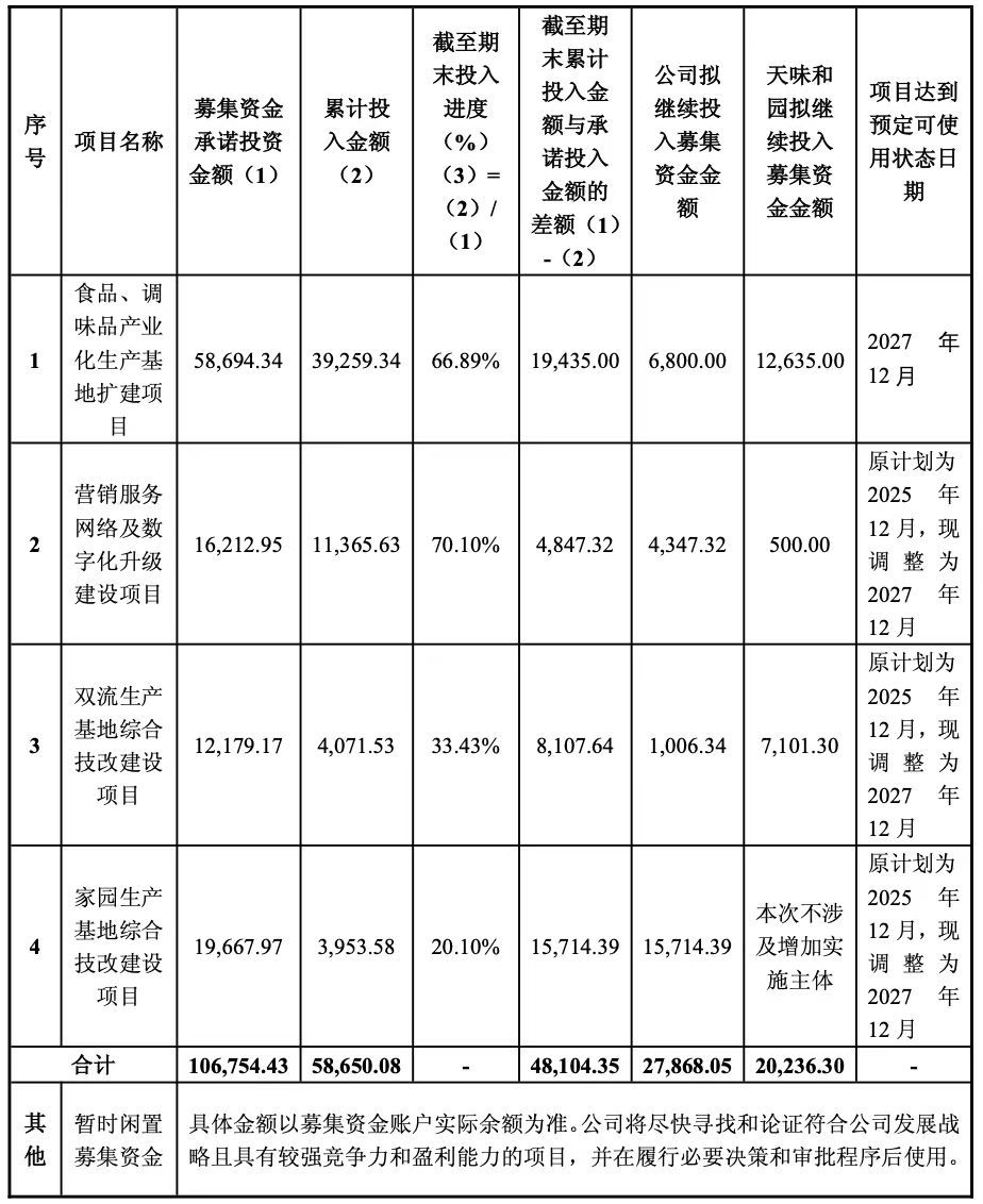 据了解,公司于2020年通过非公开发行股票募集资金净额16.22亿元,原计划将13.20亿元投入调味品产业化项目,时隔五年后,截至今年11月30日,相关募投项目累计投入金额仅为5.87亿元,承诺投资总额为10.68亿元,意味着仍有4.81亿元募集资金尚未使用,资金整体使用进度滞后。