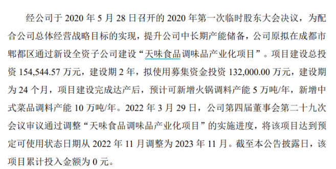 2020年公司通过非公开发行股票募得净额16.22亿元,计划投向天味食品调味品产业化项目(下称“产业化项目”)和食品、调味品产业化生产基地扩建项目(下称“扩建项目”),彼时根据公司测算,前述项目的建设周期为2年,即计划2022年11月达到可使用状态。