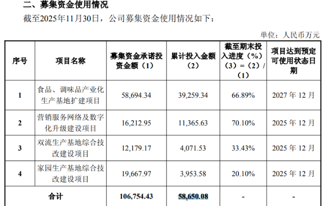 此外,从资金投入效率看,截至今年11月30日,四大定增募投项目累计投入资金仅为5.87亿元,尚有4.81亿元待投入。而此次新增的实施主体天味和园成立于2025年11月12日,注册资本2000万元,公司计划以募集资金向其增资2.02亿元用于项目实施,这一操作被市场解读为对现有资产结构的重新梳理,但也引发了关于项目前期规划合理性的质疑。