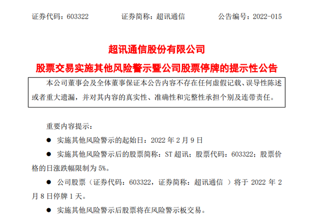 2月8日消息,今日,超讯通信(603322)公告宣布,自2022年2月9日起,公司股票被实施其他风险警示,A股股票简称由“超讯通信”变更为“ST超讯”,股票价格的日涨跌幅限制为5%。公司股票将于2022年2月8日停牌1天。