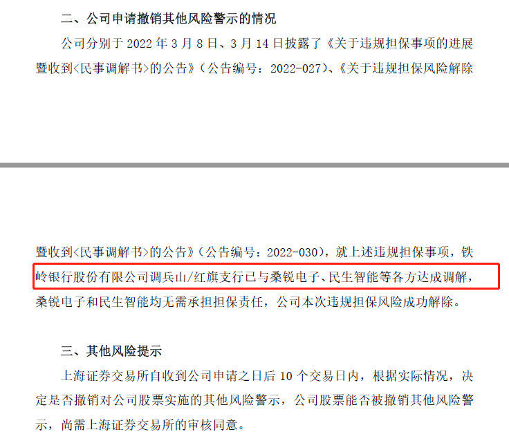 随后的3月8日及14日,ST超讯相继发布公告称,就本次违规担保涉及的诉讼案件,铁岭银行红旗支行及调兵山支行已与桑锐电子、民生智能等各方达成调解,桑锐电子和民生智能均无需承担担保责任,公司的违规担保风险成功解除。