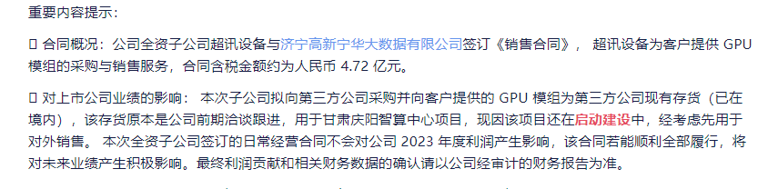 至于前述“庆阳市数据中心建设项目”,直到2023年12月底,超讯通信在披露签订另一份合同时,还介绍称“本次子公司拟向第三方公司采购并向客户提供的GPU模组为第三方公司现有存货(已在境内),该存货原本是公司前期洽谈跟进,用于甘肃庆阳智算中心项目,现因该项目还在启动建设中,经考虑先用于对外销售”。