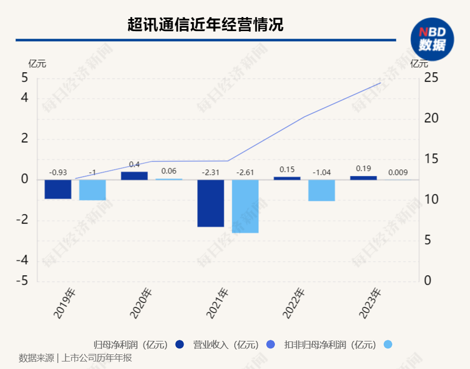 超讯通信(603322.SH,股价26.56元,市值41.86亿元)于2016年上市,2019年首次出现亏损。自此以后,5年间公司营收由12.67亿元增至24.45亿元,但盈利情况却一言难尽。