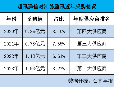 江苏盈讯是超讯通信2020年至2023年连续4年的年度前五大供应商之一。超讯通信历年对江苏盈讯的采购额分别为3565.2万元、7544.95万元、1.13亿元和1.53亿元,分别占比3.10%、7.65%、6.61%和8.27%,江苏盈讯分别是超讯通信第四大、第三大、第三大和第二大供应商。