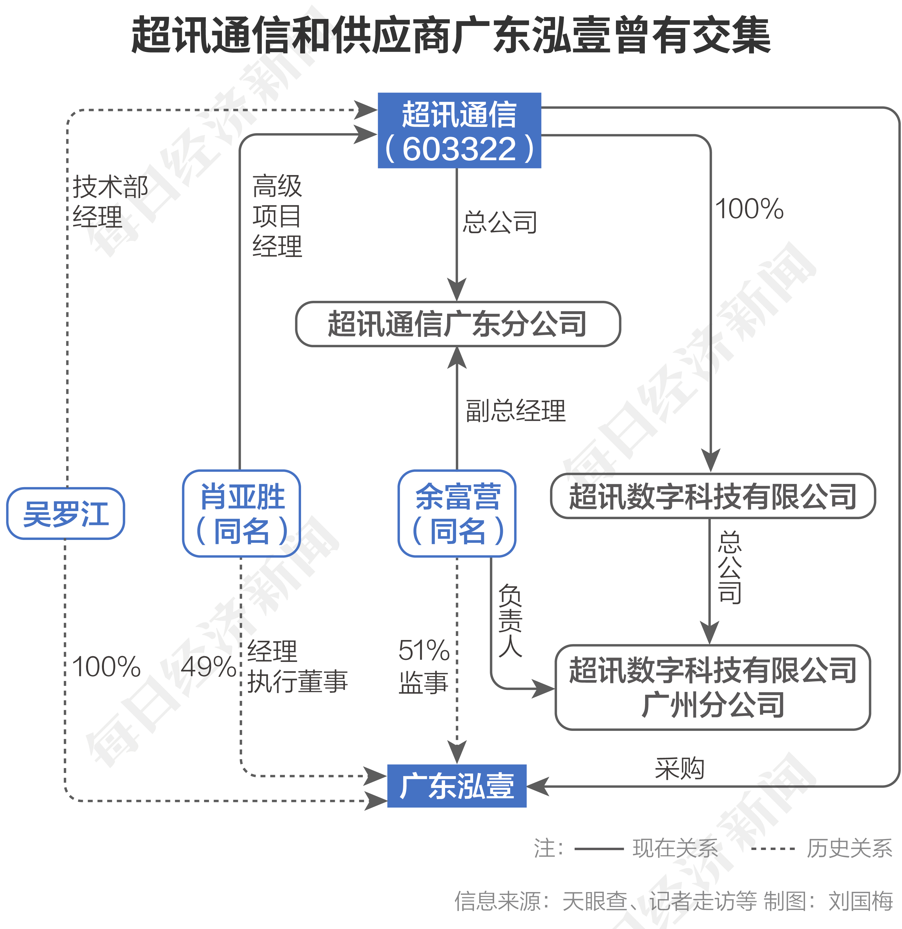 查询显示,超讯通信100%持股超讯数字科技有限公司,而后者的广州分公司负责人是余富营。