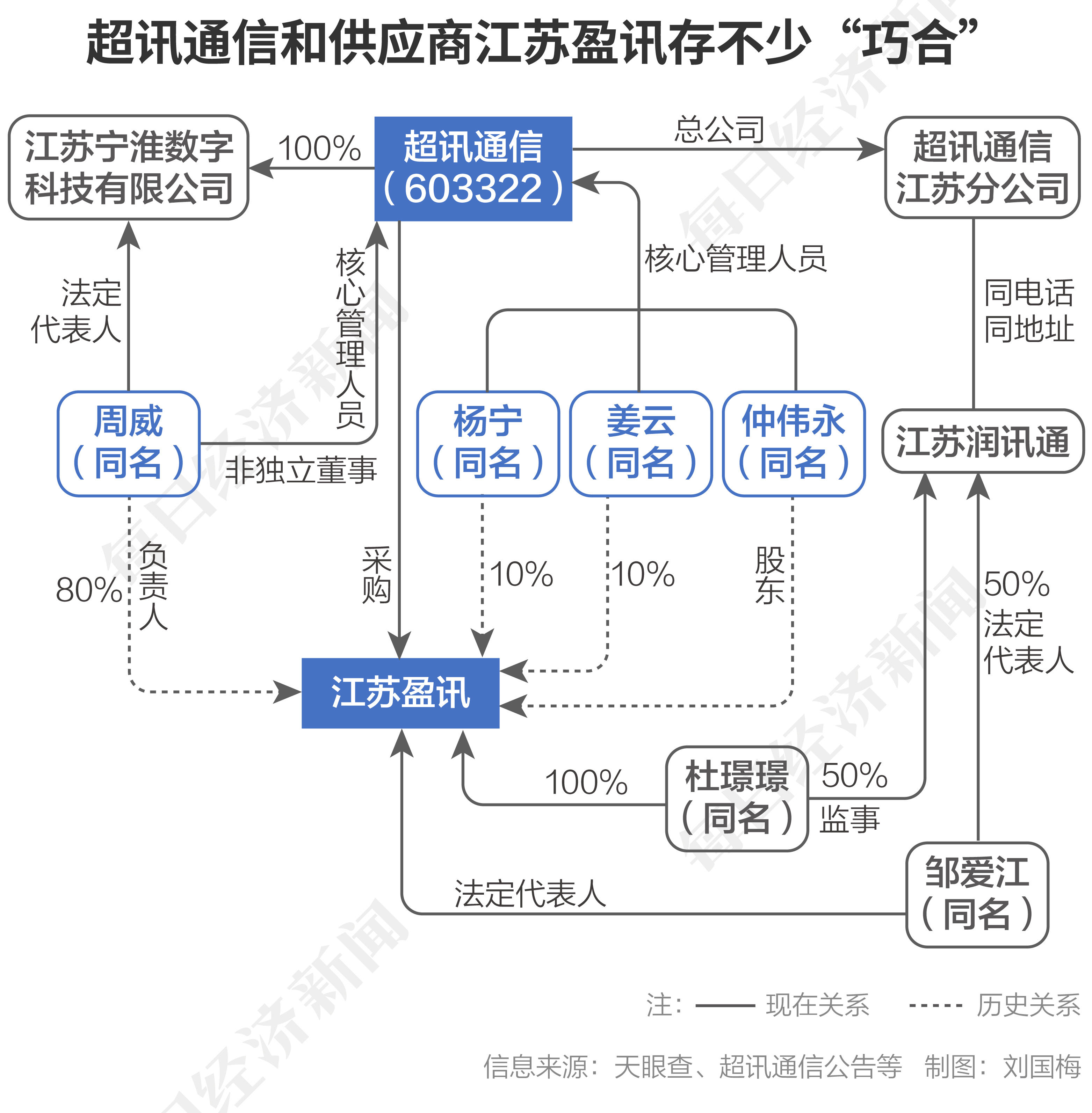 周威,江苏盈讯2020年2月至2023年5月的大股东、2020年2月至2021年6月的负责人。相同的名字,自2021年初起,出现在超讯通信多份公告中:超讯通信2021年限制性股票激励计划首次授予激励对象,“周威”被认定为“核心骨干”;2022年首次股权激励名单中也有“周威”,他位列第一、是核心管理人员;2022年7月,超讯通信宣布其全资子公司江苏宁淮数字科技有限公司成立,法定代表人为“周威”;2023年12月,超讯通信临时股东大会通过决议,“周威”被选举为公司非独立董事。