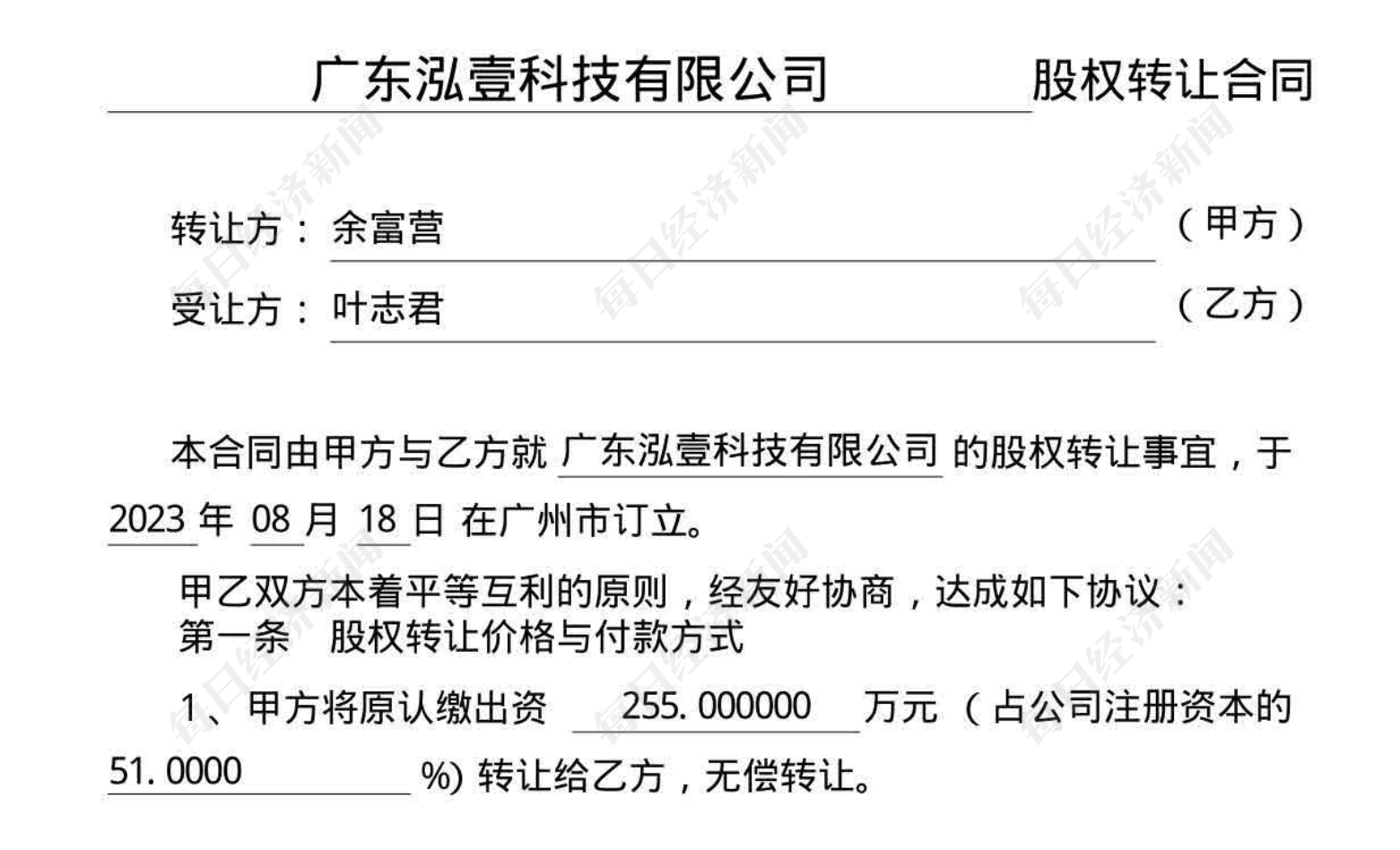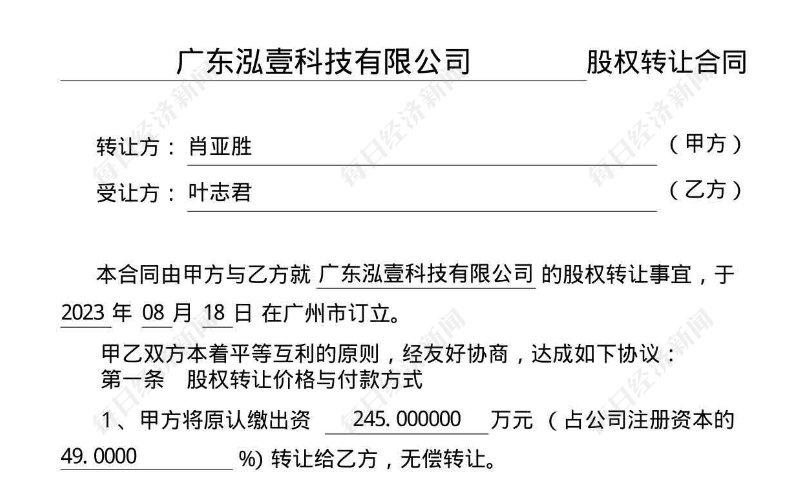 此外,广东泓壹在工商局备案的2023年8月的一份股东会议决议和股份转让合同显示,余富营、肖亚胜分别将原认缴出资的255万元(占注册资本的51%)、245万元(占注册资本的49%)无偿转让给叶志君;股东会同意叶志君认缴出资500万元。