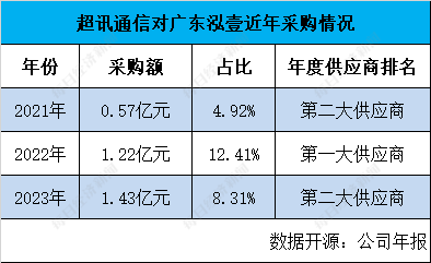 成立于2020年2月的广东泓壹科技有限公司(以下简称广东泓壹),当年便成为超讯通信年度第二大供应商,超讯通信向其采购5653.07万元,采购占比4.92%。2021年广东泓壹跃升至年度第一大供应商,对应1.22亿元采购额,采购占比12.41%;2022年进一步攀升至1.43亿元,采购占比8.31%,依然是年度第二大供应商。
