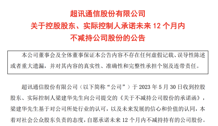 界面新闻注意到,超讯通信2023年5月曾发布公告称,梁建华向公司提交《关于不减持公司股份的承诺函》,梁建华基于对公司所处行业的认可,以及未来发展的信心和价值的认同,本着对社会公众股东负责的态度,自愿承诺未来12个月内(2023年5月31日至2024年5月30日)不减持持有的公司股份。