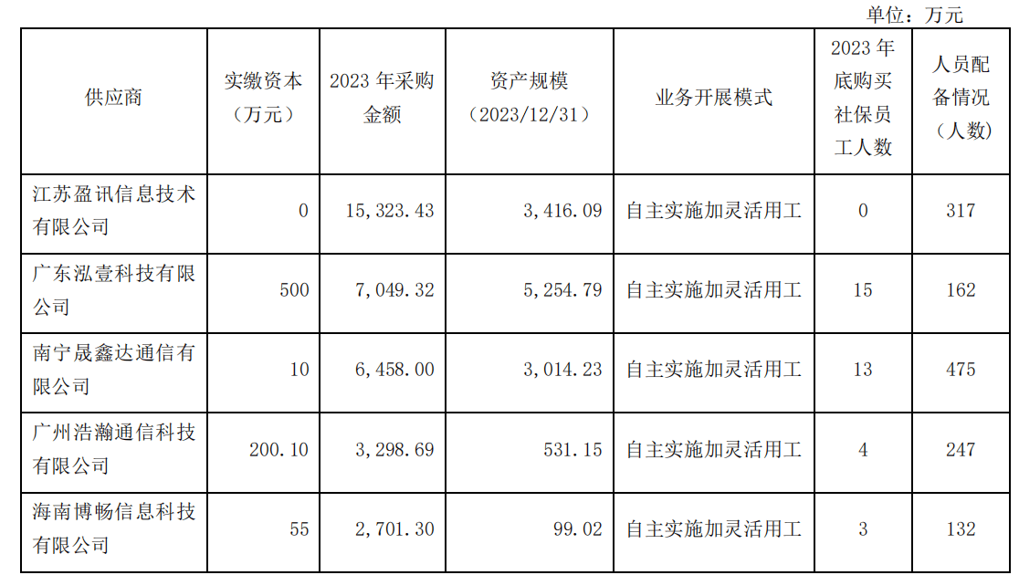 根据2023年报披露显示,公司前五大供应商采购金额为7.27亿元,占年度采购总额的 39.25%。公司多名员工曾为公司通信技术服务业务供应商的股东或员工,涉及供应商共10家,其中江苏盈讯等5家公司均曾名列公司近三年前五大供应商。