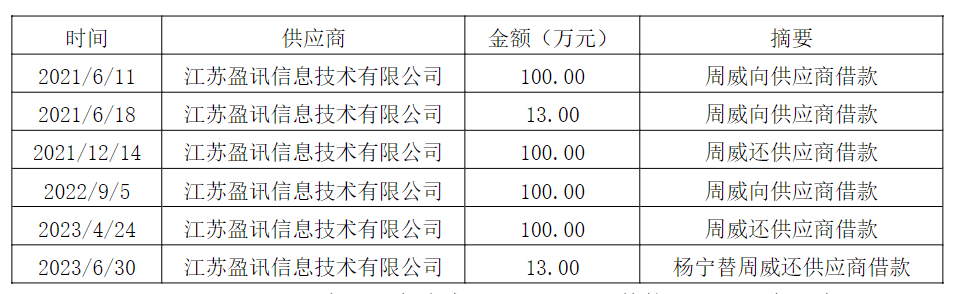 值得关注的是,董事周威与江苏盈讯之间的资金流动情况已经得到确认。根据详细资料显示,周威个人向供应商所借款项累计流水金额达到人民币426万元,且这些借款均为无息性质。同时,在借款偿还过程中,存在公司员工杨宁代替周威向供应商归还借款的情况。