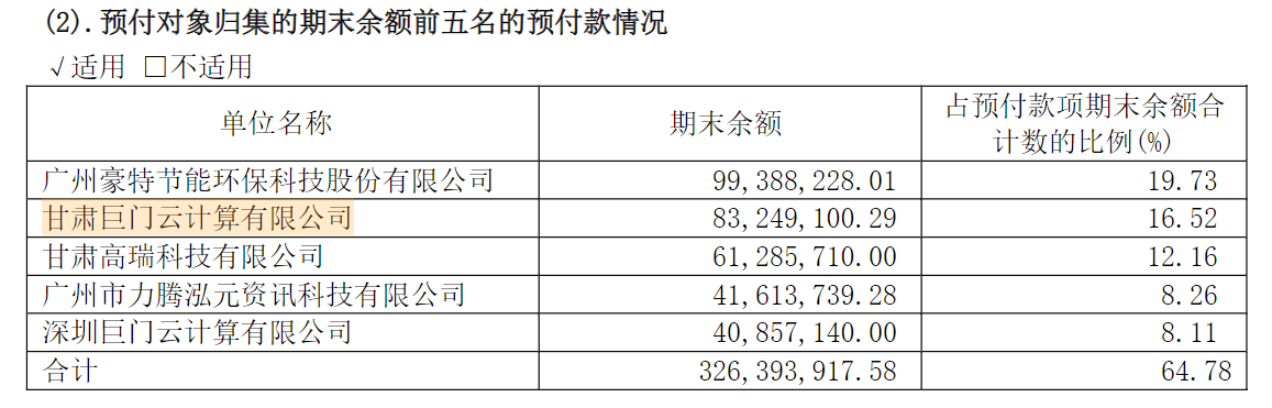 值得关注的是,这些交叉供应商中超讯通信对其预付款也较高。2023年报披露,公司预付账款期末余额为5.04亿元,同比增长764.70%;前五大支付对象中,甘肃巨门云计算有限公司、甘肃高瑞科技有限公司、深圳巨门云计算有限公司的预付金额合计为1.85亿元,占预付款比重36.71%。