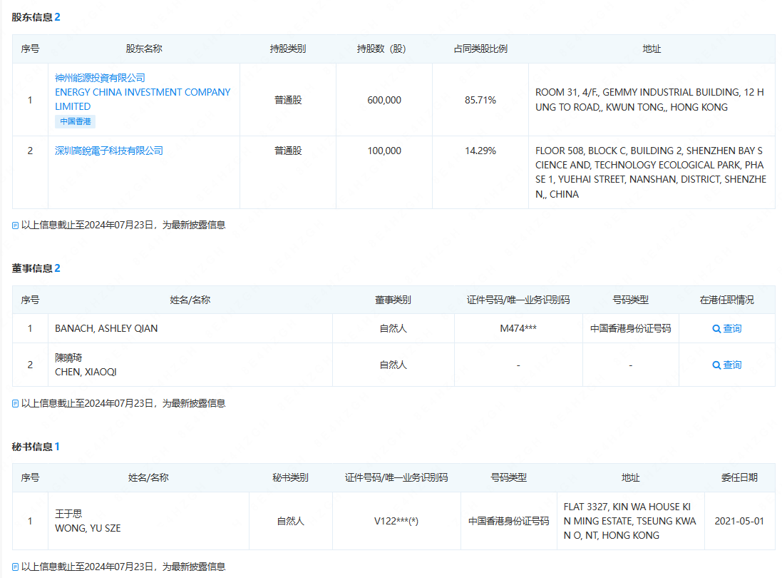 根据公开资料显示,High Sharp Electronic Limited背后股东高锐电子与神州能源投资有限公司,两者持股比例分别为14.29%与85.71%。这意味着High Sharp Electronic Limited与高锐电子存在交叉持股情况。同时,神州能源投资有限公司穿刺后其背后董事、与秘书均有王于思、BANACH, ASHLEY QIAN两人。