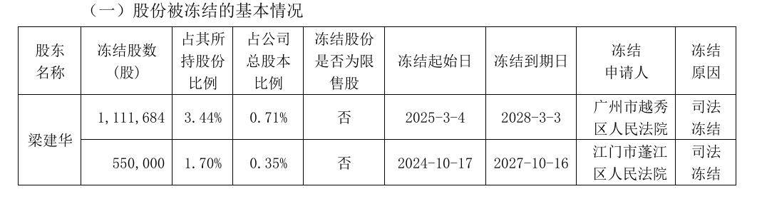 此次股份冻结后,梁建华及其一致行动人累计被质押和冻结的股份数量达到2371.17万股,占其合计持股数量的73.44%,占公司总股本的15.05%。这一消息无疑给市场带来了不小的震动。