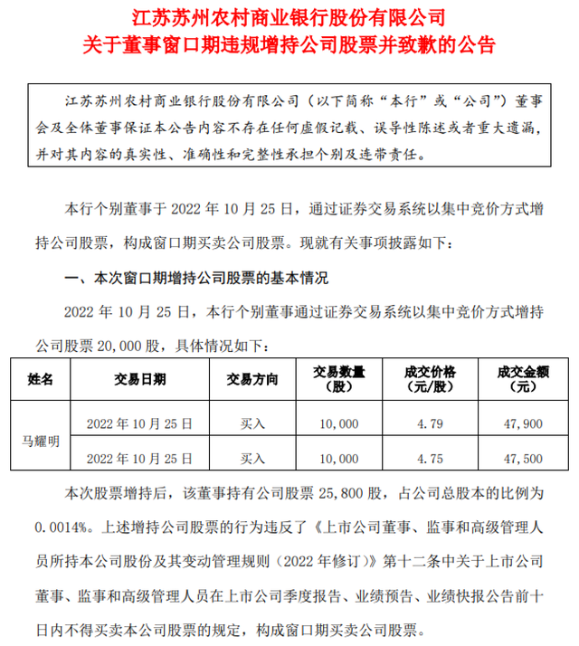 10月31日晚间,上市农商行苏农银行发布公告称,公司个别董事在窗口期违规增持公司股票2万股,违反相关规定。该董事已就违规增持行为向投资者致歉,公司将加强相关培训工作,杜绝此类事件再次发生。