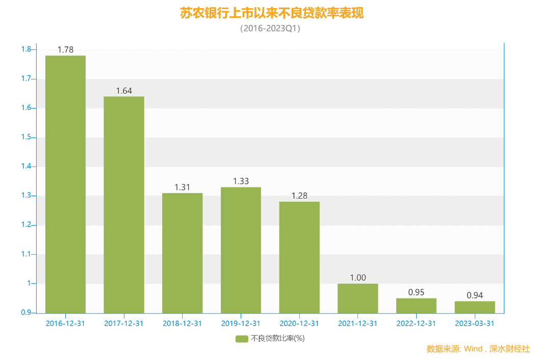 数据显示,2022年苏农银行不良率为0.95%,比上年末下降0.05个百分点,是历史最低水平。