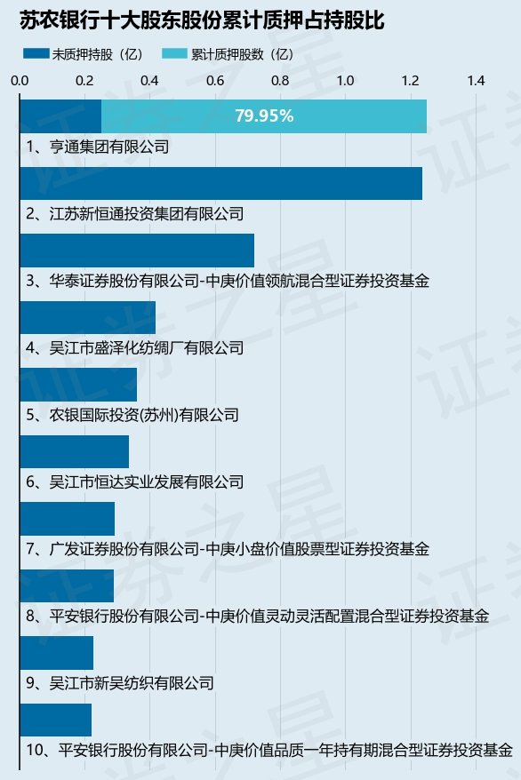 截止本公告日,股东亨通集团有限公司已累计质押股份9990.0万股,占其持股总数的79.95%。本次质押后苏农银行(603323)十大股东的累计质押股份占持股比例见下图: