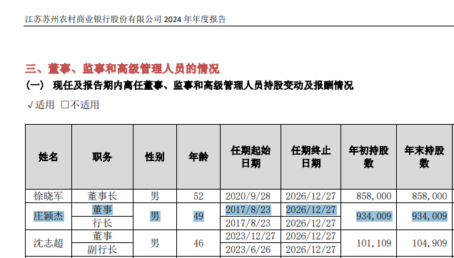 据苏农银行2024年年报信息显示,该行行长庄颖杰自2017年8月23日担任苏农银行董事、行长至今已经7年11个月,目前的任期要到2026年12月底到期。