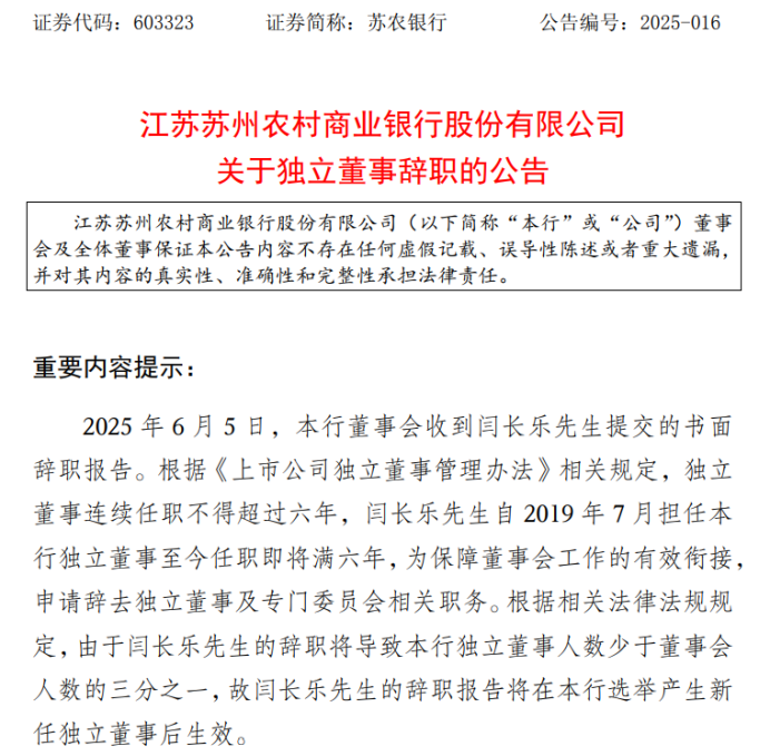 日前,苏农银行发布公告称,该行董事会闫长乐先生提交的书面辞职报告。根据《上市公司独立董事管理办法》相关规定,独立董事连续任职不得超过六年,闫长乐先生自2019 年7 月担任本行独立董事至今任职即将满六年,为保障董事会工作的有效衔接,申请辞去独立董事及专门委员会相关职务。