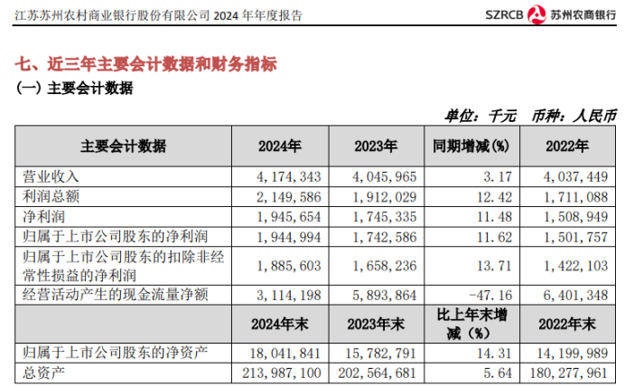 苏农银行2024年的业绩情况可以说非常好,据年报信息显示,2024年该行实现营业收入41.74亿元,同比增长3.17%,归母净利润19.45亿元,同比增加11.62%,可以说是双丰收。