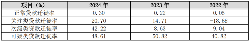 除了净息差下滑快,信贷扩张乏力,苏农银行的资产质量也面临一些挑战。不良率虽然维持平稳,但是建立在核销大增的基础上,2024年该行贷款损失准备核销了9.89亿元坏账,较2023年的6.65亿元大增48.72%。从不同贷款的迁徙率来看,正常类贷款迁徙率从0.22%上升到0.30%,关注类贷款迁徙率从14.71%上升到20.70%,次级类迁徙率从8.63%暴涨至42.22%,各类贷款的质量都有所下滑。
