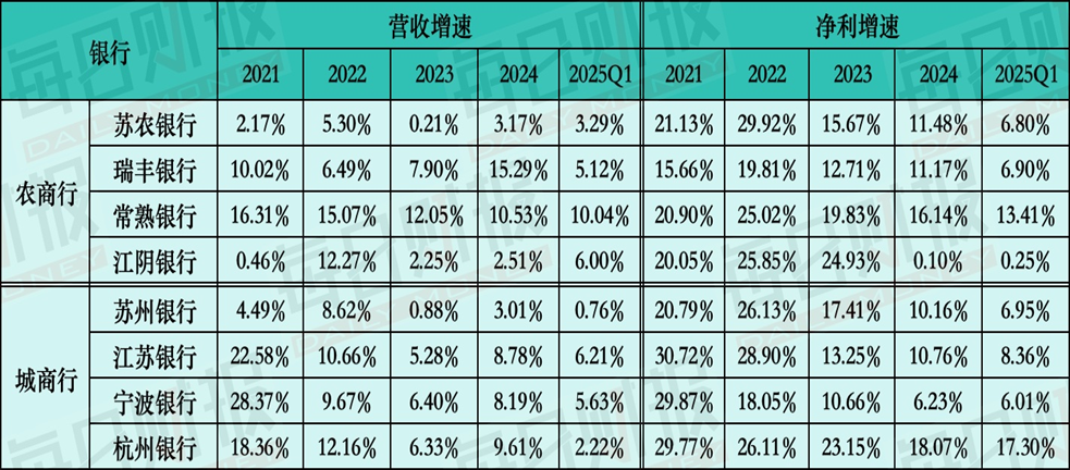 作为对比,该区域内上市农商行瑞丰银行2024年营收和净利增速分别达15.29%、11.17%,今年一季度增速则分别为5.12%、6.9%;常熟银行两项核心指标增速则更快,2024年及2025年一季度营收增速均超10%,净利增速超13%。同时,苏农银行体量较江浙区域内的江苏银行、宁波银行、杭州银行等优秀城商行还有很大差距,且业绩增速也不及这些大块头的银行,竞争力有些偏弱。