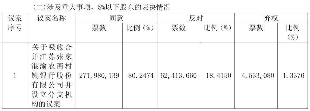 日前,苏农银行召开2026年第一次临时股东会,审议通过了《关于吸收合并江苏张家港渝农商村镇银行股份有限公司并设立分支机构的议案》。上述议案反对票占比为13.0821%,特别是持股5%以下中小股东反对票比例达到18.415%,引起市场关注。