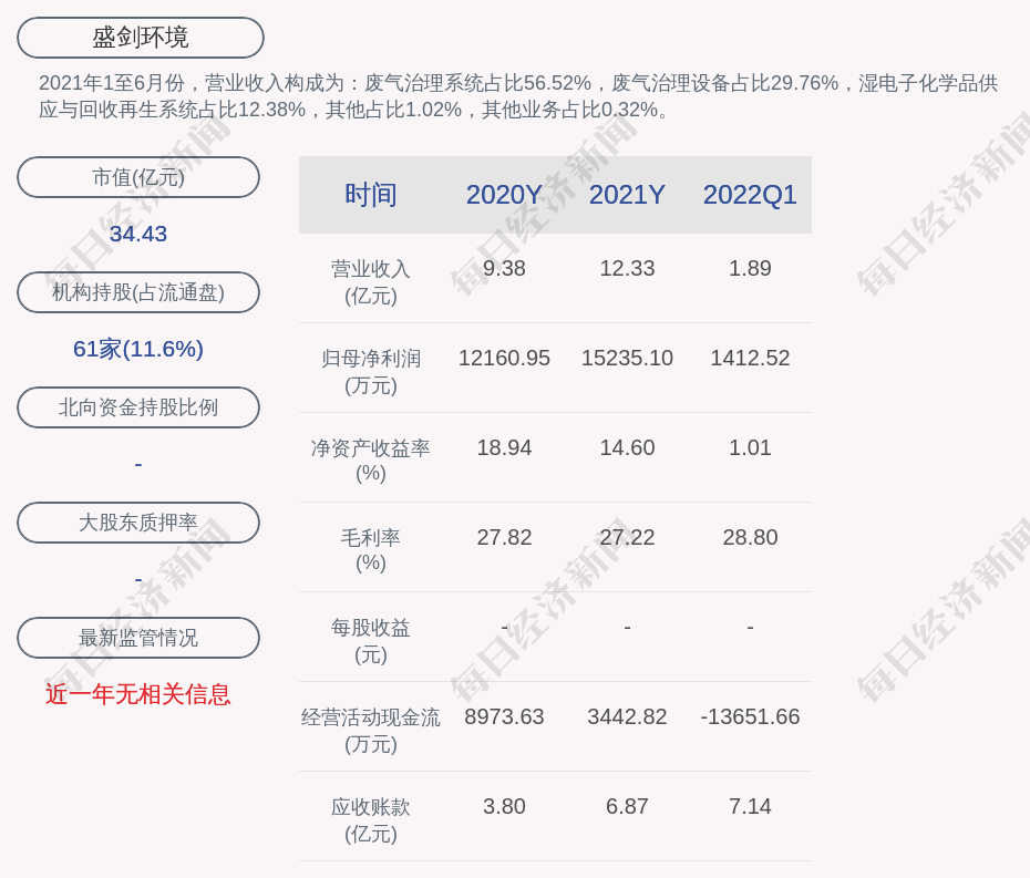 2021年1至6月份,盛剑环境的营业收入构成为:废气治理系统占比56.52%,废气治理设备占比29.76%,湿电子化学品供应与回收再生系统占比12.38%,其他占比1.02%,其他业务占比0.32%。