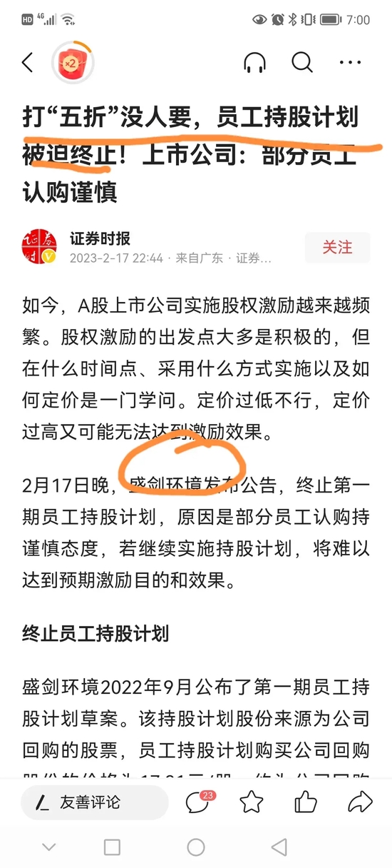 证券时报发了一篇报道,盛剑环境搞员工股权激励计划,股价打五折卖给员工,结果没人要,最终计划终止。