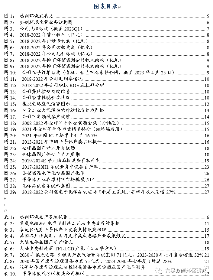 | 泛半导体废气治理领军企业,纵横拓展打造新增长极。公司2005年成立,主营工艺排气管道;2012年进入泛半导体领域;2016年拓展废气治理设备;2017年进军湿电子化学品;2022年新能源领域取得较大突破。公司在巩固泛半导体废气治理系统领先地位的同时,打造“工艺废气治理系统(中央治理)+制程附属设备(源头控制)”“湿电子化学品供应 回收再生系统+电子材料”的产品矩阵,具备一体化竞争优势。刚需 高壁垒铸就泛半导体废气治理价值。废气产生于泛半导体生产过程多个环节,带来废气治理系统 设备需求。1)泛半导体废气治理直接参与制程保障产品良率,为刚性需求。工艺废气需要与生产工艺同步进行收集、治理和排放,废气治理系统及设备安全稳定性直接关系到产能利用率、产品良率等。2)泛半导体废气组分复杂技术要求更高,客户认证壁垒彰显价值。与一般行业相比,电子工业排放限值更严格 管控的污染物种类更多,工艺废气治理系统和生产过程结合更为紧密,考虑生产稳定性,客户认证层面彰显高壁垒。公司客户资源优质。主要客户包括中芯国际、华虹半导体、京东方、华星光电、隆基绿能、宁德时代等龙头,优质稳定客户资源为公司持续发展提供重要支撑。高景气度 国产替代加速,泛半导体废气治理空间广阔,公司市占率有望快速提升。半导体产业景气度高企,大陆主要晶圆/面板产线2021-2025年产能复增16.6%/8.0%。我国半导体IC对外依存度高,“芯片法案”下国产替代进程加速。2030年大陆废气治理系统/设备空间99/79亿元,假设2023/2030年,集成电路废气治理系统、面板废气治理系统、废气治理设备的国产化率分别达到30%/70%、55%/90%、30%/70%,对应2030年国产废气治理系统/设备空间71/55亿元,2023-2030年复合增速32%/28%。2021年,公司于光电显示/集成电路废气治理系统市占率分别为49%/24%;于制程附属设备市占率为13%,整体国产化率约23%。公司在光电显示领域废气治理系统市占率近50%,高市占率有望复制到集成电路,市占率随国产化进行而快速提升。积累行业经验 客户资源,切入湿电子化学品领域。湿电子化学品在集成电路和平板显示领域国产化率仅为25%,国产化率待提升。2017年,公司借助行业经验 客户积累纵向延伸至湿电子化学品领域, 2018-2022年该业务收入复增27%,国产化趋势下保持高速发展。盈利预测与投资评级:公司已在半导体 面板废气治理具备一定行业地位,并拓展新能源领域;国产化趋势下市占率有望快速提升,我们预计公司2023-2025年归母净利润2.15/2.94/3.87亿元,同增65%/37%/31%,PE 22/16/12倍(估值日期2023/5/22),首次覆盖,给予“买入”评级。风险提示:下游行业资本支出波动,原材料价格波动,行业竞争加剧 |