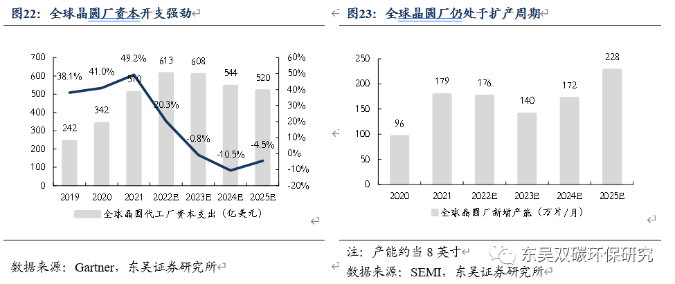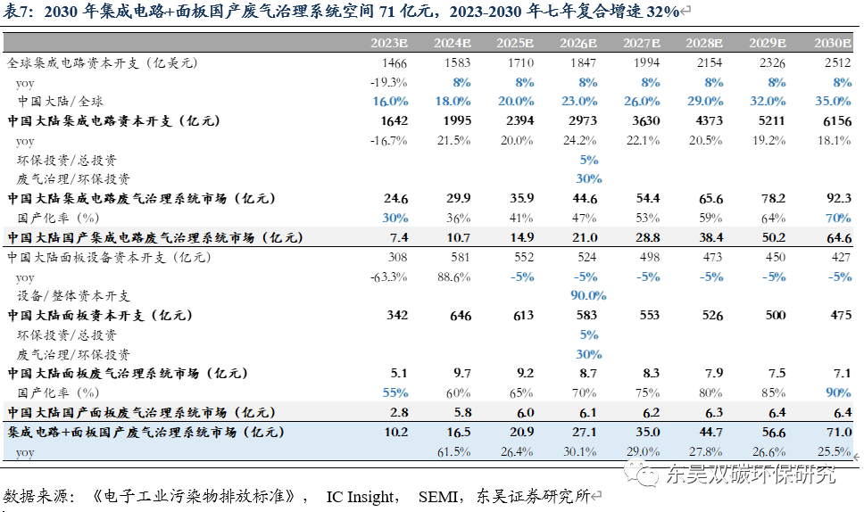 3)假设中国大陆集成电路资本开支四年转化为晶圆新增产能。根据项目环境评价影响报告,环保投入一般为总投入5%,根据《电子工业污染物排放标准》,废气治理占环保投入比例为30%。
