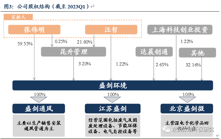 股权结构稳定且较为集中,子公司业务分工明确。截至 2023年一季度,张伟明、汪哲夫妇作为公司实际控制人直接持有公司 60.77%的股权,并通过上海昆升管理(员工持股平台)间接持有公司股权,合计持有公司61.48%的股份。公司股权结构稳定且较为集中,有利于提升公司决策效率与长远发展。公司旗下三家全资子公司业务分工明确,其中2005年成立的盛剑通风主要以生产销售安装通风管道为主;2016年成立的江苏盛剑主要负责废气及固废处理设备、节能环保设备、电气自控设备等业务;2017年成立的北京盛科达(后更名为盛剑微)专注于湿电子化学品回收业务。