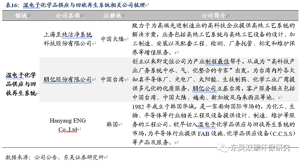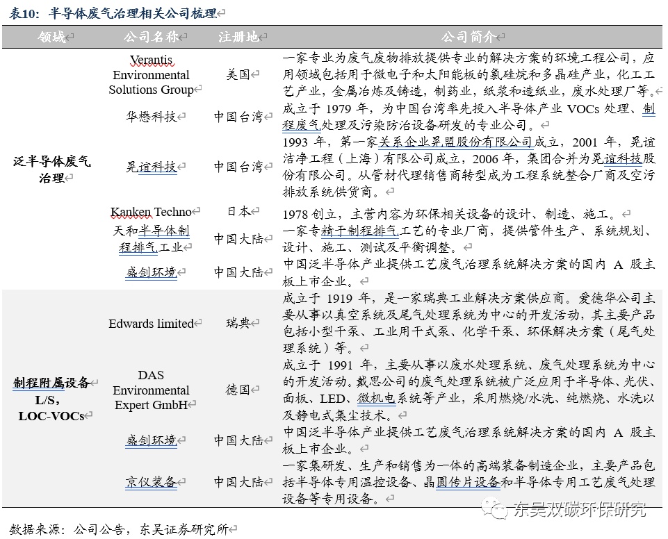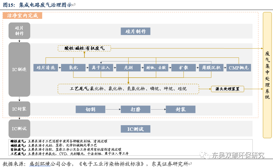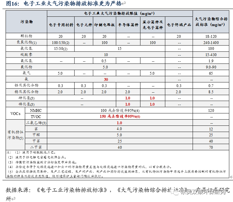 泛半导体废气组分复杂技术要求更高,客户认证壁垒彰显价值。与一般行业大气污染相比,《电子工业污染物排放标准》对电子工业相关大气污染物提出了更高的排放要求,体现在排放限值更严格管控的污染物种类更多;同时,工艺废气治理系统和下游客户生产过程结合更为紧密,出于生产稳定性的考虑,客户认证层面的高壁垒彰显价值。