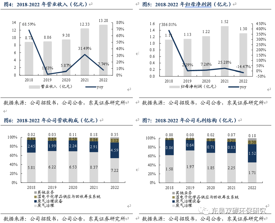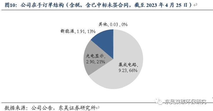 集成电路领域收入占比持续提升,新能源成为新增长极。从收入和毛利的结构来看,废气治理系统和设备收入与毛利占比超90%,未来随着湿电子化学业务逐步放量,业务结构有望调整。从下游需求领域来看,集成电路占比持续提升,收入/毛利占比从2021年的46%/49%,提升至2022年的52%/57%;新能源业务迎来突破,2022年新能源领域的收入/毛利同比大幅增加263%/198%,收入/毛利占比从2021年的4%/5%、提升至2022年的15%/13%,成为新的业绩增长点。根据细分订单情况,截至2023年4月25日,集成电路/光电显示/新能源领域在手订单含税金额(含已中标未签合同)分别为 9.23/2.90 /1.91 亿元,占比66%/21%/13%,新能源游领域持续拓展。