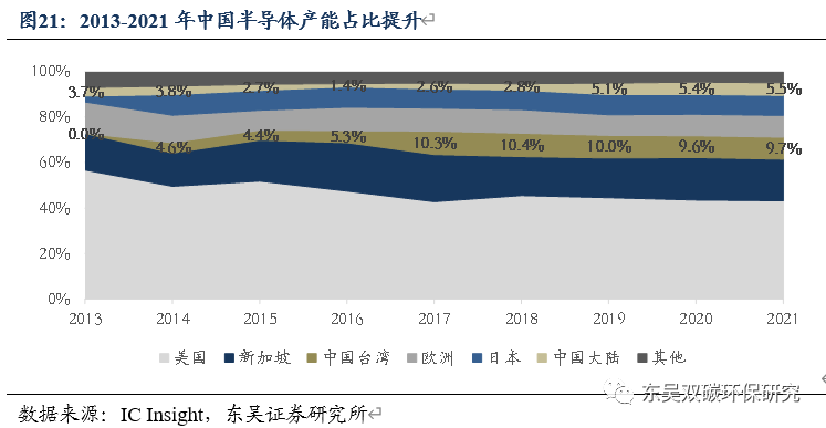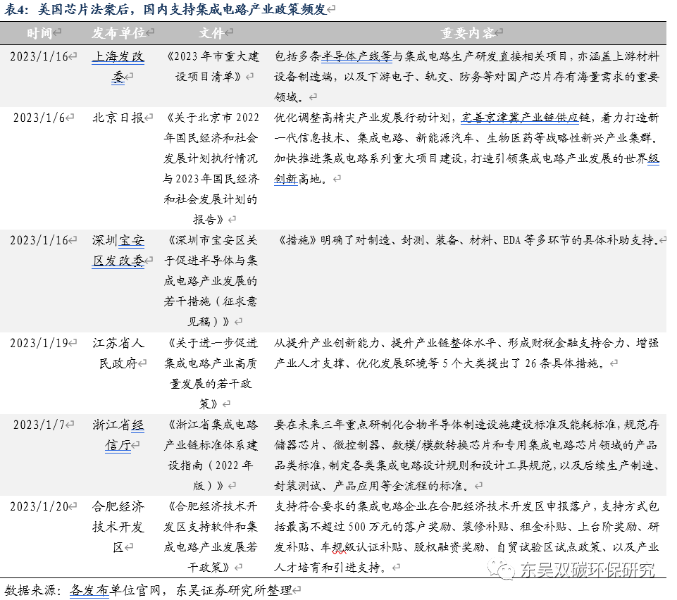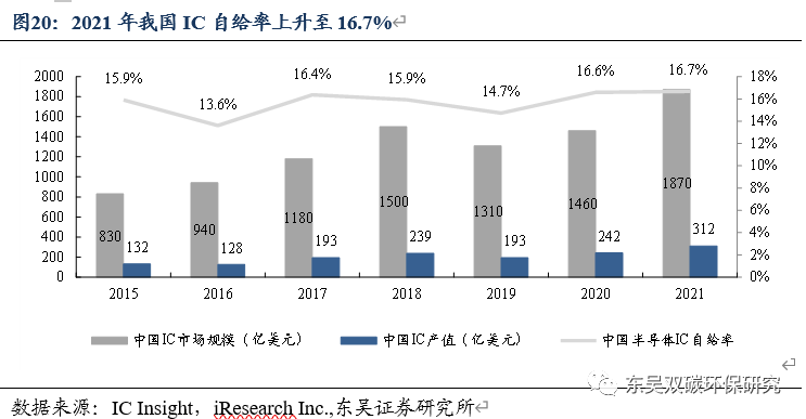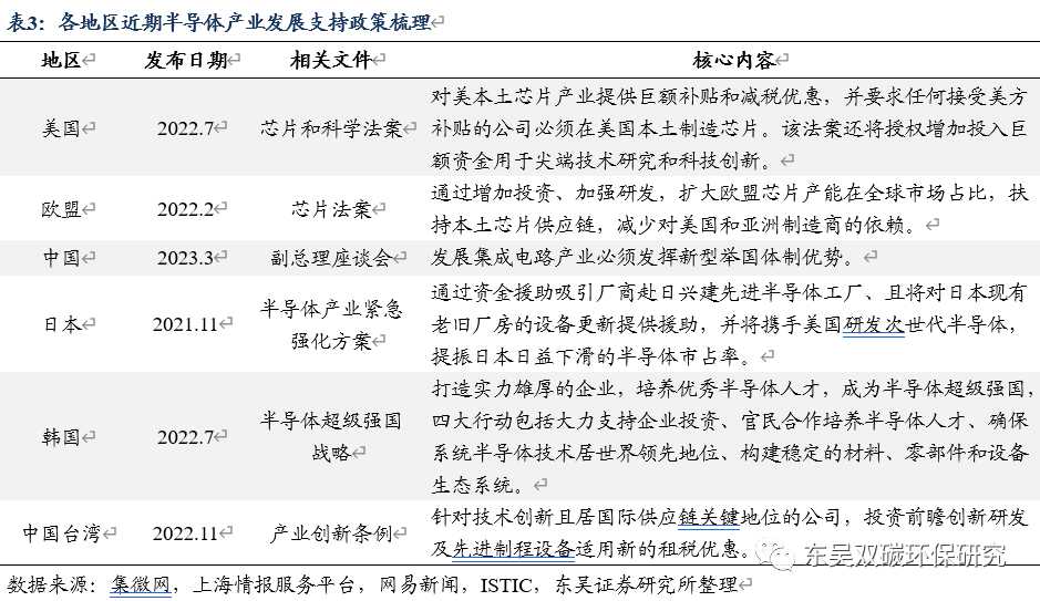 Circuit)进出口长期存在贸易逆差,对外依存度高,尤其体现在高端芯片方面;2015-2021年,我国IC自给率总体呈现上升趋势,到2021年达到16.7%,但与国务院2015年印发的《中国制造2025》中的:“到2025年,70%的核心基础零部件、关键基础材料实现自主保障”的目标仍有较大差距。劳动力成本的上升使得偏向劳动密集型的代工和封测环节逐步转向我国台湾与大陆,产业向东迁移;而美国《2022芯片和科技法案》将产业链召回,通过补贴加速芯片产业回流美国,意图切断向中国供应半导体芯片先进制程的技术和设备及材料,隔断中国芯片产业与全球联系,重塑全球芯片产业链供应链格局。《2022芯片和科技法案》的签订无疑加速了中国半导体产业国产替代的进程。在半导体设备国产化提速的背景下,鼓励半导体设备发展的政策频发,国内半导体产业发展将进一步提速。